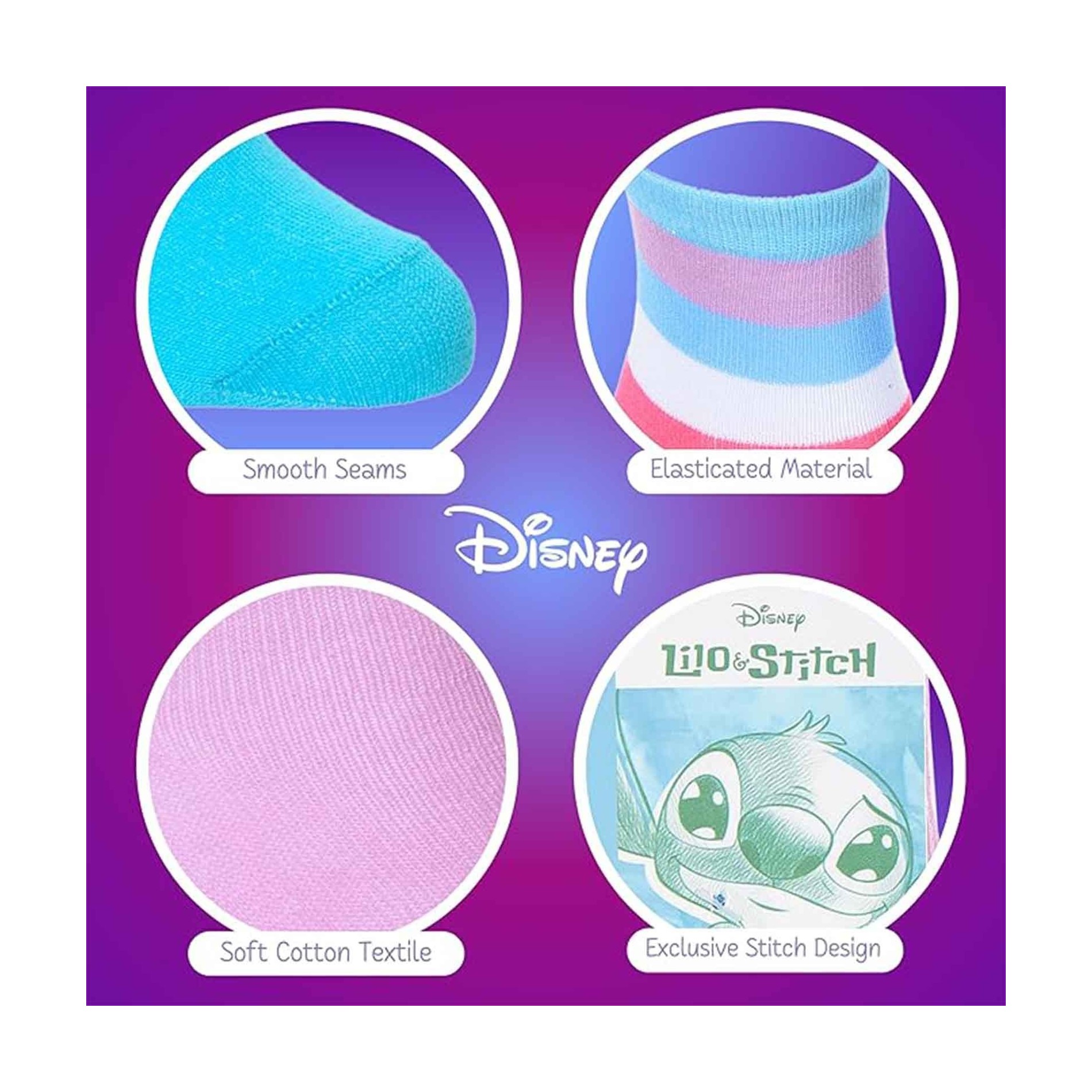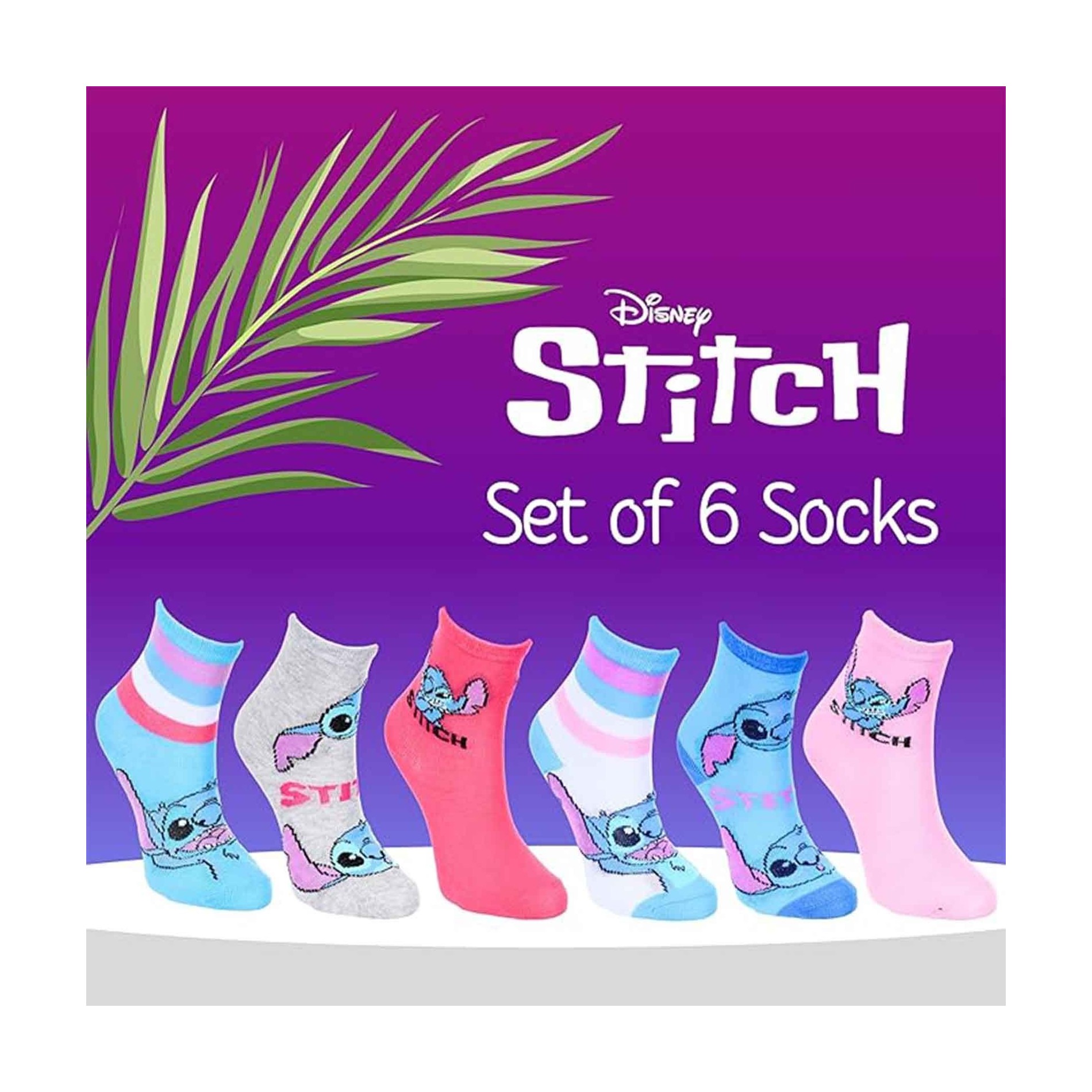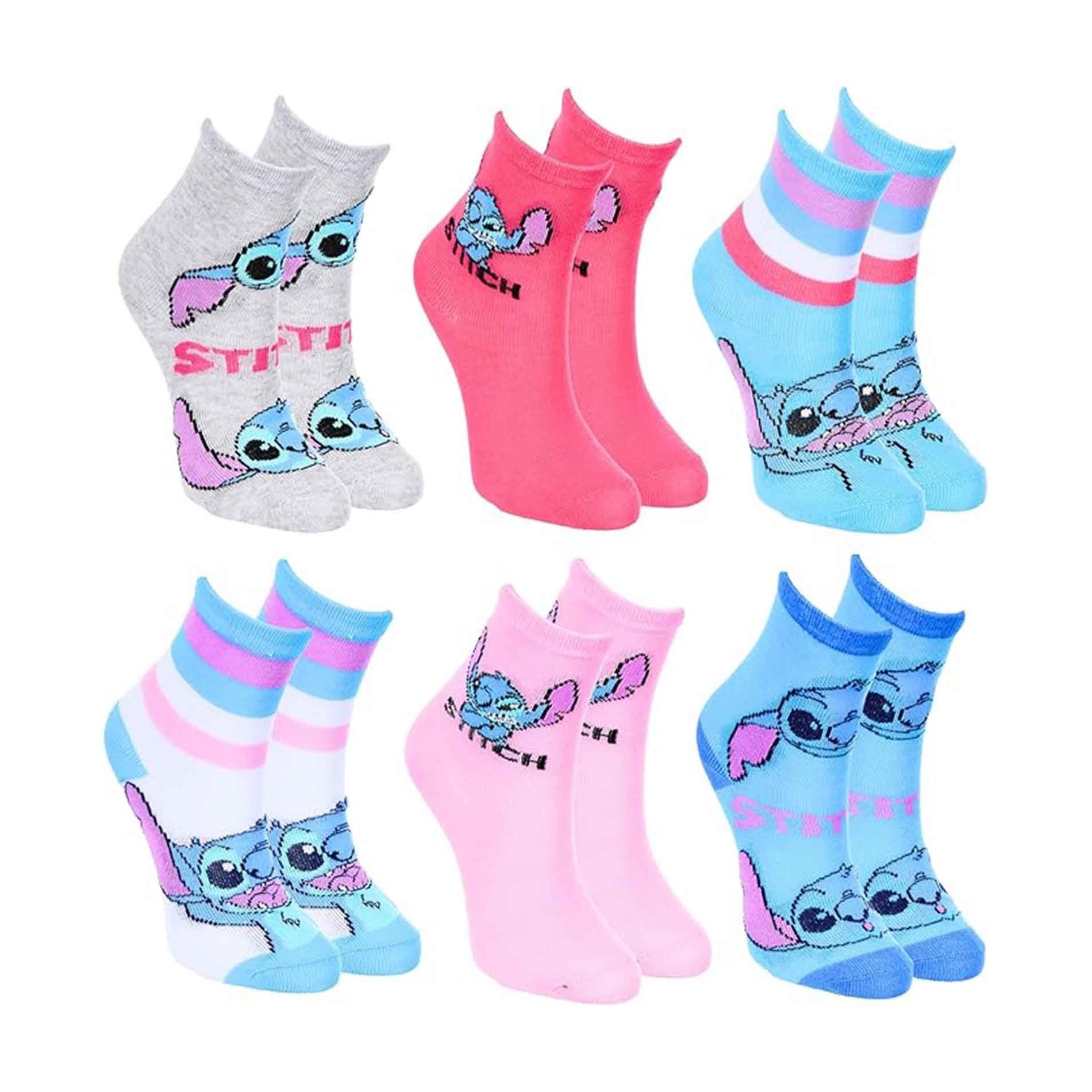 Förpackning med 6 par "Lilo & Stitch" flickstrumpor - officiell Disney-licens. Mjuk bomull, Stitch-mönster, olika färger. Perfekt för vardagsbruk.