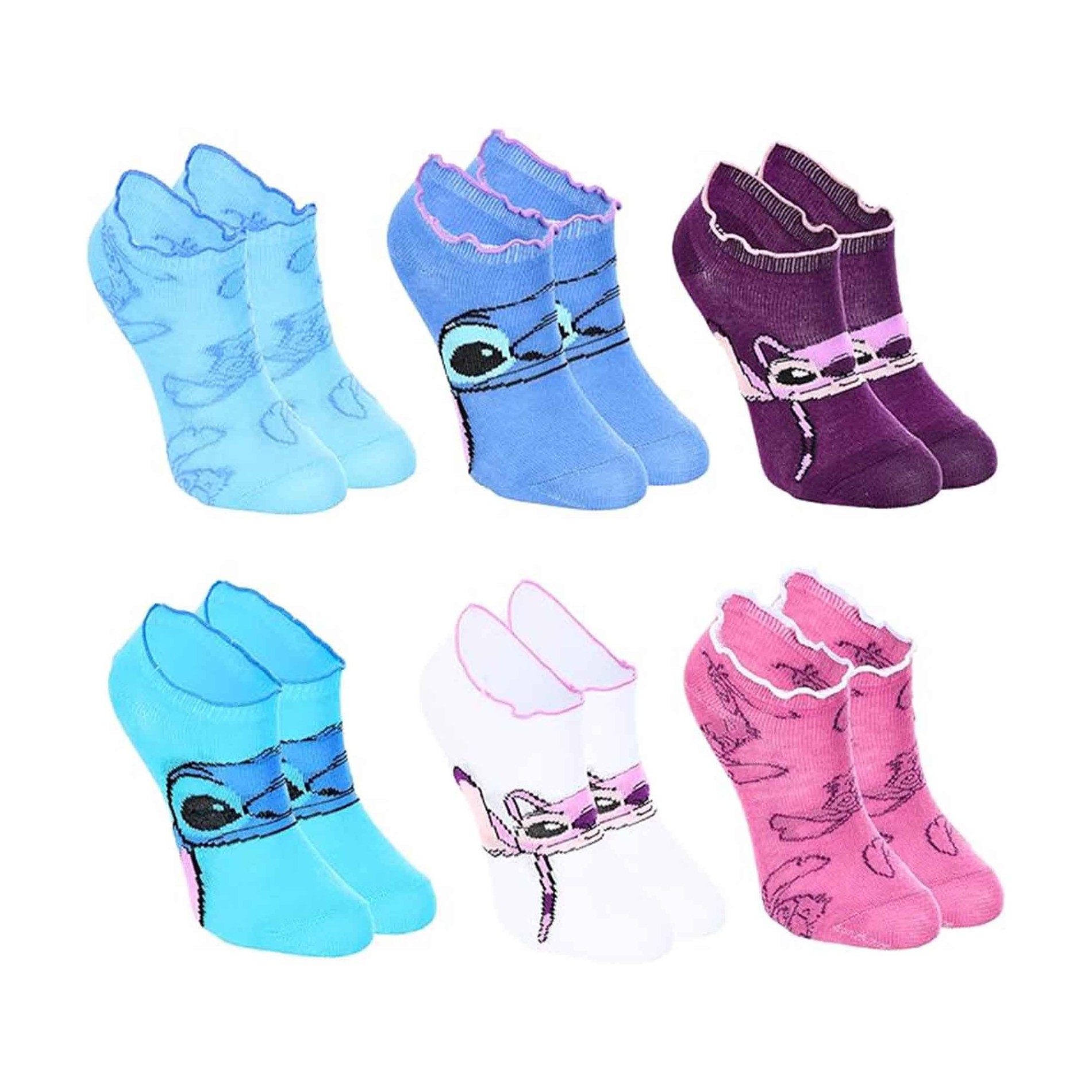 Förpackning med 6 par "Lilo & Stitch" flickstrumpor - Vågiga kanter, olika färger, mjuk bomull. Stitch & Angel-motiv - officiell Disney-licens.