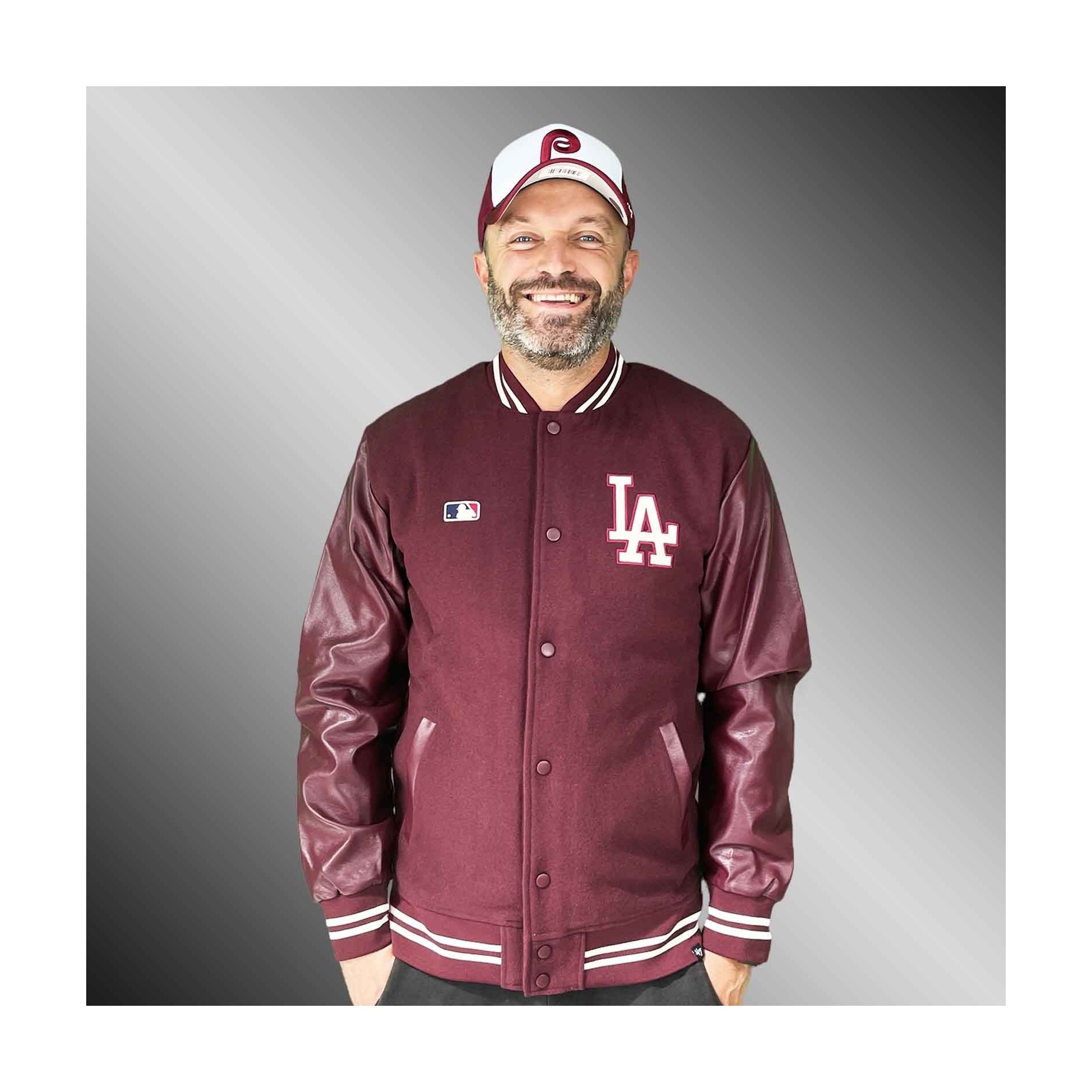 Stor broderad LA-logotyp på framsidan.